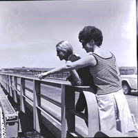 From left to right, Helga Bauer and Norma Herzinger look over the railing of the Perrine Memorial Bridge. Helga Bauer is a visitor from Germany taking a tour of the area. Mrs. Herzinger points out something in the canyon to the guest. A car is parked to the side. In the background, dirt and sagebrush stretches out into the distance.