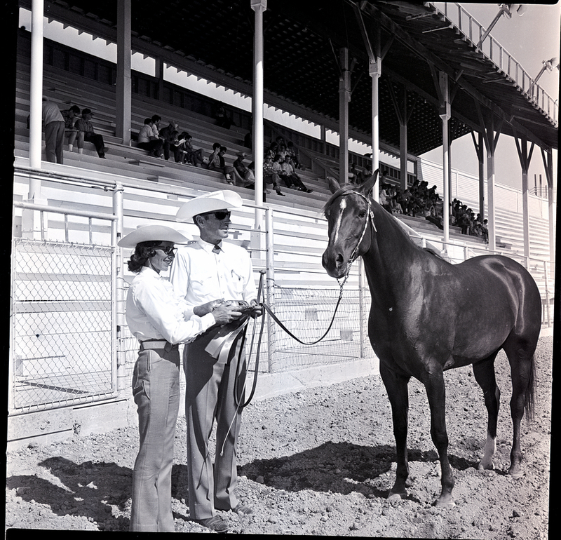 The top Arabian mare, Carinosa, owned by Dr. and Mrs. B. P. Husband, stands in a corral at the Idaho All-Arabian Horse Show. From left to right, Gerrie Paladini presents a dish trophy and award ribbon to Jeff Wonnell, the mare's trainer. They are dressed in cowboy hats and boots. To the side of the corral, several people sit on bleachers watching the horse show.