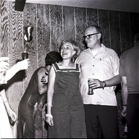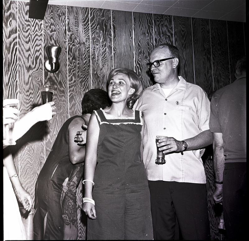 Mr. and Mrs. Horney visit with guests at their farewell party held at the home of Tommy Walker. Mr. Horney is holding a glass of beer in one hand and wraps his other arm around Mrs. Horney. Other guests with glasses of beer are enjoying themselves at the party.