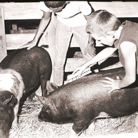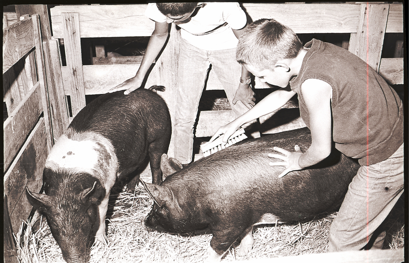 - Two boys comb some pigs in a pen at the Gooding County Fair.