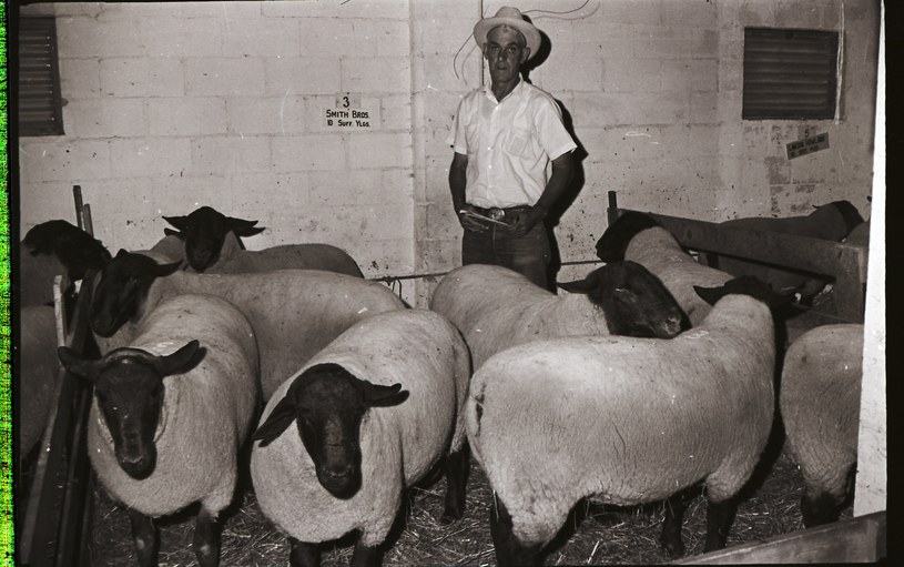 - A man wearing a cowboy hat stands inside a sheep pen of top rams at a ram sale. On the back wall is a sign that reads "3 Smith Bros. 10 Suffolk yearlings."
