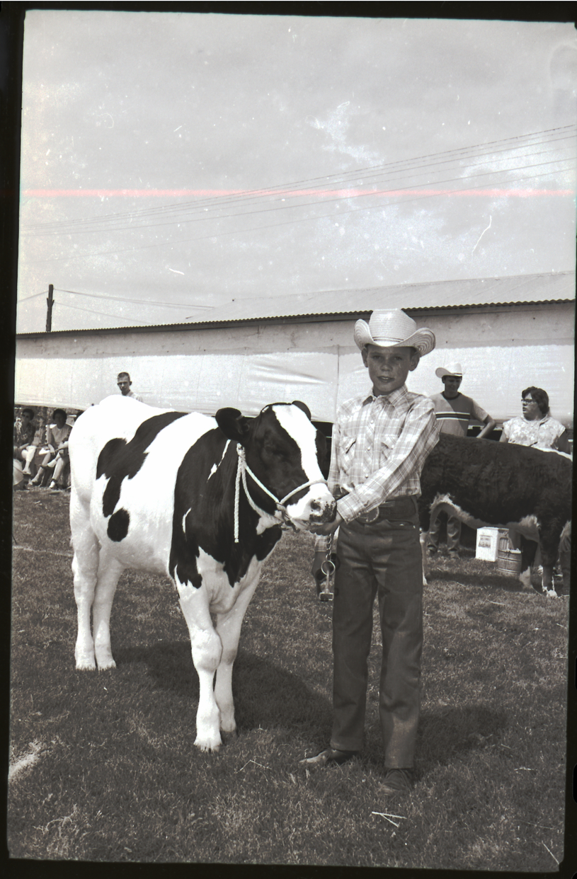 - A little boy dressed in a western plaid shirt and cowboy hat shows off his cow at the Lincoln County Fair. Behind him is a stable, and another cow is out on display. Several people stand along the side of the stable.