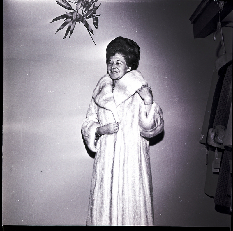 Norma Herzinger models a long mink fur coat from Stefani Brothers Furs at The Mayfair Shop in Twin Falls. A leaf decoration hangs on the wall above her. To the right, several other coats dangle from hangers.