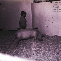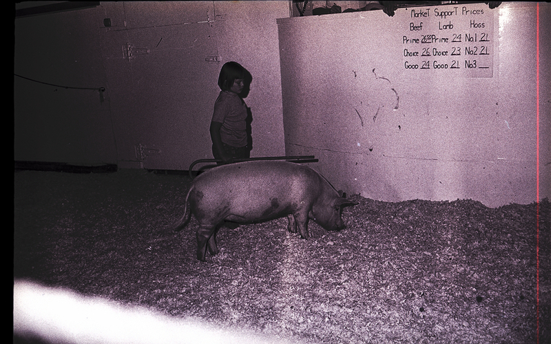 Barbara Hall shows her grand champion hog at the Jerome County 4-H and FFA Fat Stock Sale. She sold the 204-pound hog to Shelby's Market, Twin Falls, for $167.28. On the wall is a sign reading "Market Support Prices, Beef, Lamb, Hogs."