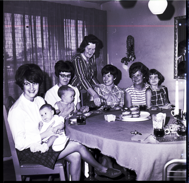 husband is the new school system psychiatrist, Mrs. Broadwater's husband is student teaching biology at Twin Fails High School, and Mrs. Watson's husband is a member of the Twin Falls High School coaching staff. Miss Keppner is holding Mrs. Roberts' daughter, Becky. On the table are pitchers of tea, glasses, a plate of donuts, an ash tray, and a candle holder. A mirror and a wall decoration hang on the side wall. Behind them is a curtain drawn over a glass door leading to the backyard.