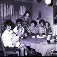 A get-acquainted tea in honor of Gloria Keppner, right, new physical education teacher at O'Leary Junior High School, was hosted recently by Mrs. Earl Lake and her daughter, Mrs. Dave Roberts at the Lake home. Mrs. Roberts, standing, is serving, from left to right, Mrs. Larry Watson and her daughter Shelley, Mrs. Michael Broadwater and her son Mike, and Mrs. Ron Watson. Mrs. Watson's