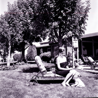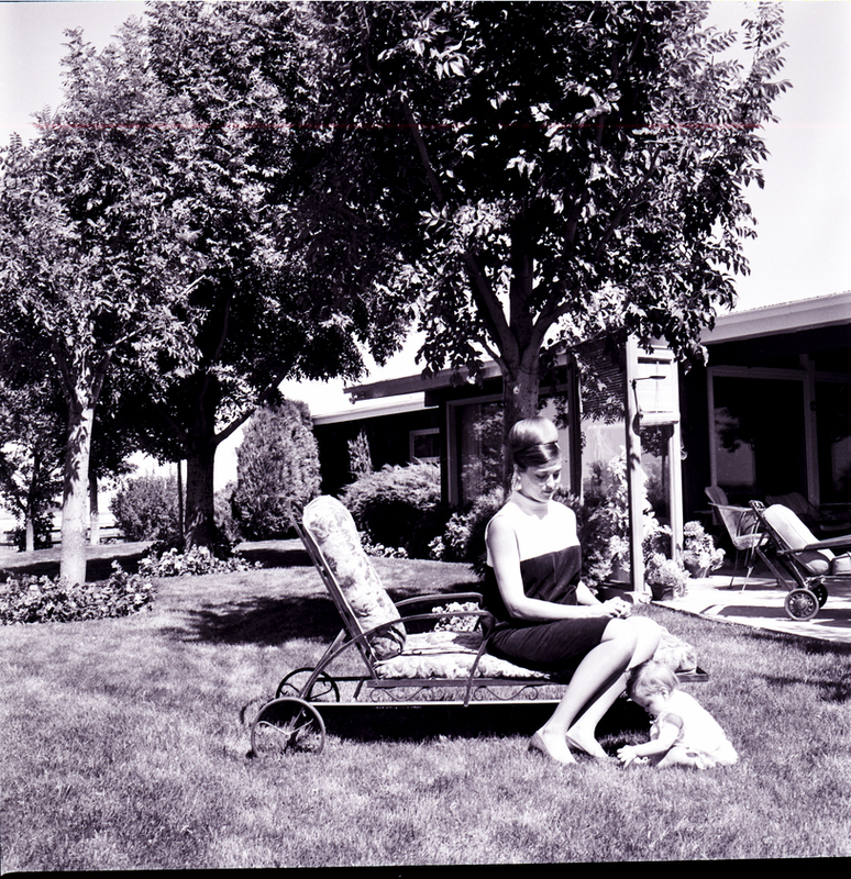 Taking advantage of the gorgeous patio at the R. P. Parry home is Mrs. John Rosholt and her daughter, Becky. Mrs. Rosholt is head hostess for the Junior Club at the Parry home for the upcoming Tour of Homes. She sits in a lawn chair, and her daughter sits on the ground by her feet. Lawn chairs and potted plants sit on the pack patio of the house. Several large trees are in the yard, and bushes surround the sides of the house.