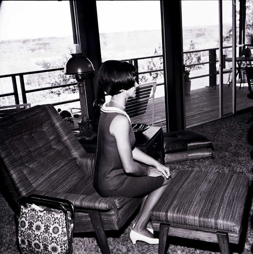 Mrs. William Reese, Junior Club hostess of the home of Mr. and Mrs. Robert Goss for the upcoming Tour of Homes, sits on a recliner in a living room. Beside the recliner is an end table that has a lamp and an ash tray on it. Some cushions sit on the floor. A porch is seen through large windows and sliding glass doors at the back of the room. A lawn chair and a dining set are on the back porch. Beyond the back porch is a view of the Snake River Canyon.