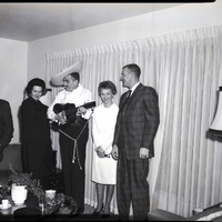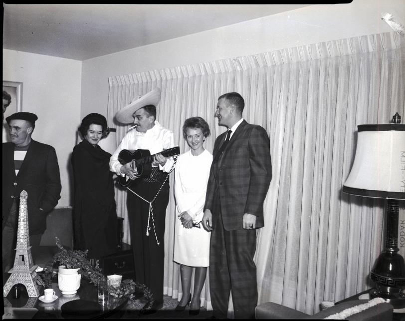 From left to right, Robert Bralisford, Mrs. Jerome Wilson, Jerome Wilson, Mrs. George Coiner, and George Coiner attend a bon voyage party held in honor of the Coiners before their trip to Europe. Mr. Bralisford is dressed in a French beret and stands behind a scale model of the Eiffel Tower. Mr. and Mrs. Wilson are dressed in Spanish costumes. Mr. Wilson wears a sombrero and plays a guitar. Mrs. Coiner is dressed in a white dress, and Mr. Coiner wears a suit and tie.