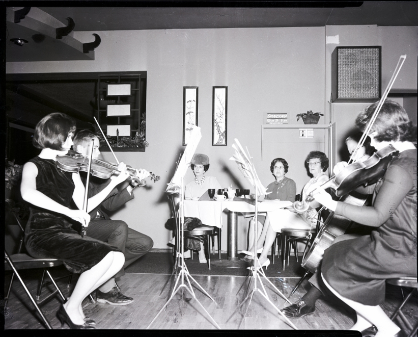 A string quartet plays "String Quartet No. 6" by Verrall for a crowd of people at the Twin Falls Federated Music Club's 14th annual White breakfast. On the right, Barry Hamilton plays a cello and Nancy Schow plays a violin. On the left David Hamilton and Kathy Holm play violins. Some attendees of the breakfast are seated around the players watching.