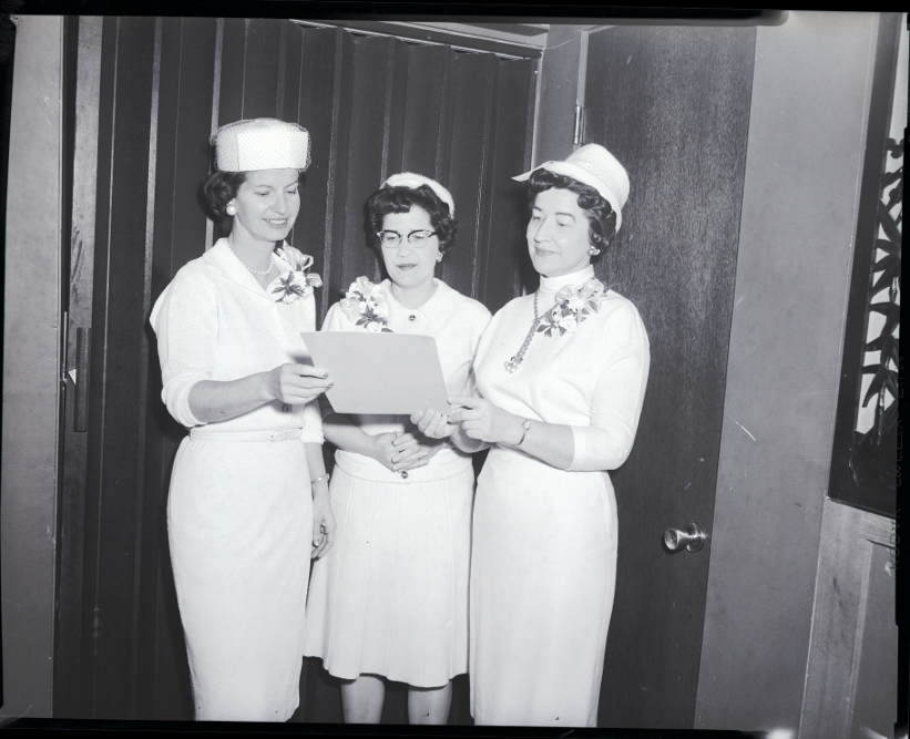 - From left to right, Mrs. Robert Carleson, Mrs. James Kinney, and Mrs. Donald Youtz, dressed in white dresses, corsages, and bonnets, examine the Double Award for Merit for "Parade of American Music" at the Twin Falls Federated Music Club's 14th annual White breakfast.