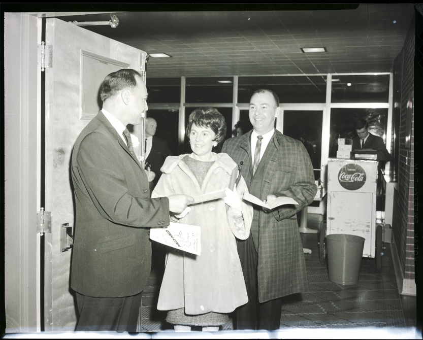 Mr. Jack Threlkeld, dressed in a suit and tie and coat and a woman, and Mrs. Threlkeld, dressed in a dress and fur coat, receive a program for the Dilettante Group of the Magic Valley's production of the musical "Can-Can," held at the Filer High School auditorium. The program reads "The Dilettante Group of the Magic Valley Presents Cole Porter's Can-Can." A vendor stands behind a Coca-Cola refreshment cart in the background.