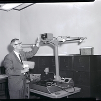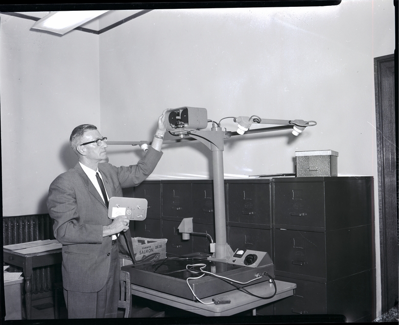 - County clerk Harold Lancaster, dressed in a suit and tie, loads film into a new camera which will be used to microfilm Twin Falls county records at the county court house. A wall of file cabinets is behind the camera.