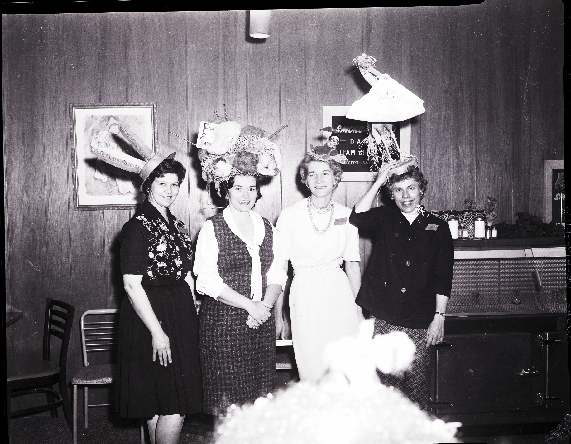 A group of original hat creations are modeled at the Welcome Wagon Newcomers Club April Fool's Day luncheon meeting held in the Depot Grill Caboose room. From left to right are Mrs. Wayne Robinson, Mrs. J. A. Milrany, Mrs. Phillip Whiting, and Mrs. Ed Goldade. Mrs. Robinson is wearing a black dress with a floral design on the top, and a hat with some bunny ears on it. Mrs. Milrany is wearing a plaid dress with a sailor style collar and a hat covered in balls of yarn and knitting needles. Mrs. Whiting is wearing a white dress and a hat with a clown resting under a paper umbrella on it. Mrs. Goldade is wearing a black shirt and plaid skirt and a hat of a crane figurine, holding a wrapped baby blanket in its mouth. The blanket reads "Destination Goldades." Several curled ribbons decorate the crane's head and tail. Some chairs and a grill with a counter top holding some salt shakers are in the background. A painting of a clown and a poster for smorgasbord hours hang on the wall behind them.