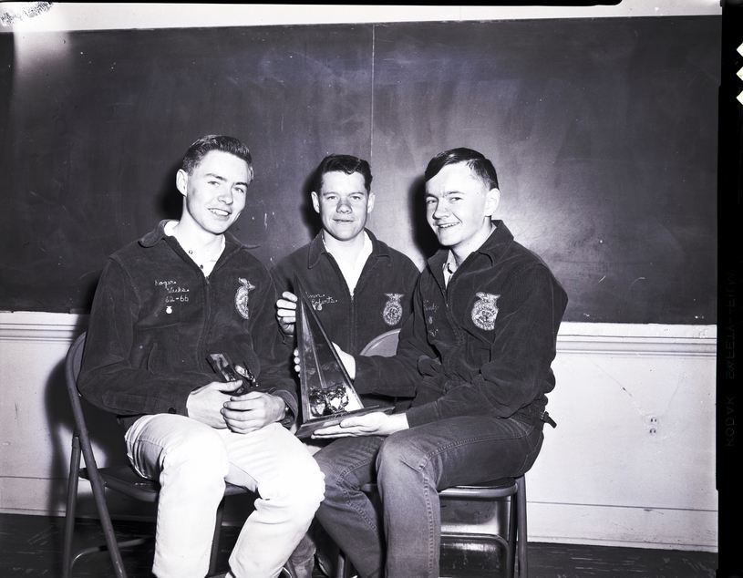 Diary products contest winners display their team trophy. The Kimberly team won the South Magic Valley district FFA dairy products contest. From left to right are Marvin Anderson, Loren Honstead and John Hamby. Anderson also was the individual high point scorer in the contest.