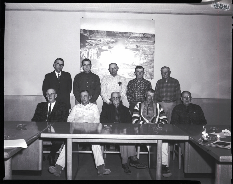 - Ten men, members of the Twin Falls Cattlemen Association, gather around a table. C. W Daigh, Don Ramseyer, and Tom Callen are in attendance. Some papers and ashtrays are on the table. A large photograph of Shoshone Falls hangs on the wall behind them.