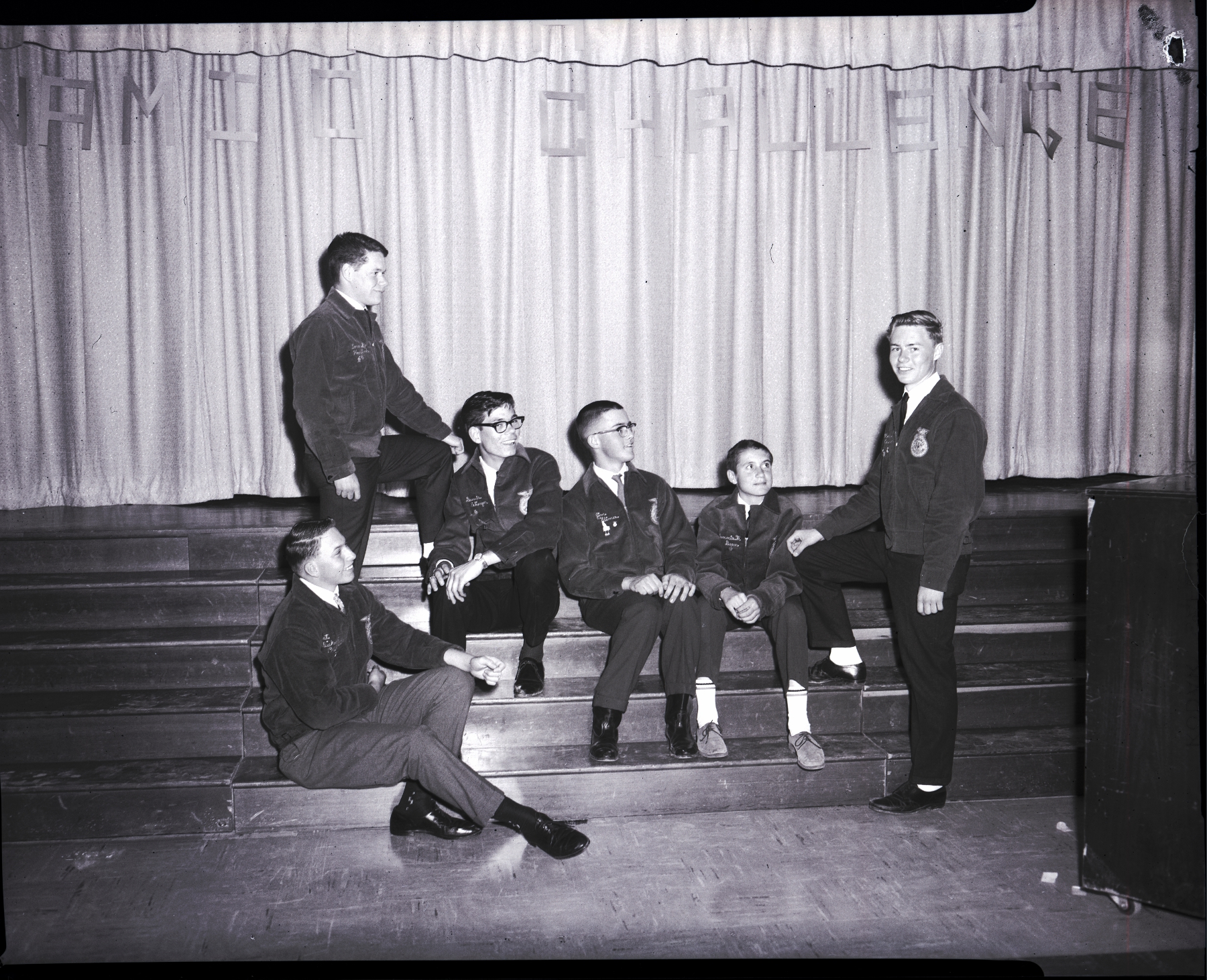 - New Kimberly FFA officers sit on a staircase. They are dressed in suits, ties, and FFA jackets. In attendance are Dennis Eslinger, Jim Klimes, Dennis M. Dean, and Loren Honstead.