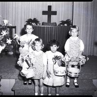 From left to right, Doralee Welch, Judy Stepanovich, Anita Hernandez, and Jody Stepanovich carry May baskets for offering at the United Church Women's May Fellowship luncheon at the Church of the Brethren. The little girls are all wearing dresses. An African American man, Bob Nora, dressed in a suit and tie holds the handle of one of the baskets. Flower pots filled with lilies decorate the sides of the stage. A display with a cross is in the background.
