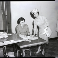 Registering at the South Central Home Demonstration Council meeting held at the Methodist church is Mrs. Roy Hondo, Cassia county council president, right. She is dressed in a dress, hat, and white gloves. Mrs. Harvey Maxon, Twin Falls county treasurer, is directing the registration. She sits behind a table, holding a pen and looking at some forms. A table to the side reads "Registration." Syringa Club members were in charge of the registration. Another woman stands in the background.