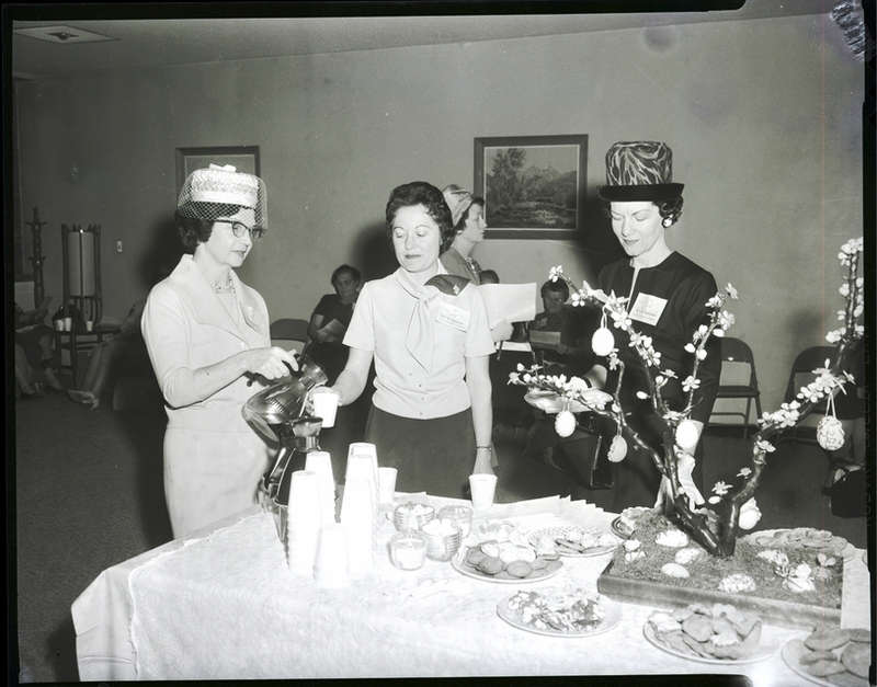 Serving coffee at the South Central District Home Demonstration Council get-acquainted coffee hour is Mrs. Wesley Sonius, left, member of the Merry Marrieds Club, to Mrs. Robert Moldenhauer, center, president of Town and Country Club, and Mrs. Loren Anderson, secretary and treasurer of the Town and Country Club. The Merry Marrieds club members and Homebuilders club members were hostesses for the coffee hour. The three women are wearing dresses, and Mrs. Sonius and Mrs. Anderson are wearing hats. The table has a small flowering tree decoration and plates of cookies, cups, and napkins. Some people can be seen seated in folding chairs below a painting hanging on the wall in the background.