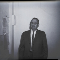 - Lund Christensen, dressed in a suit and tie, stands in the corner of a room. On the wall beside him is a light switch and a bulletin board filled with papers.