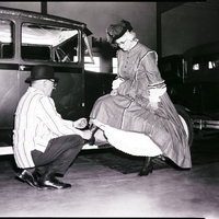 Ben R. Box fixes his wife's high-buttoned shoe next to an old car at a Horseless Carriage Club tour and old-time fashion show. Mrs. Box is wearing a dress, petty coat, and bonnet, and Mr. Box is wearing a striped shirt, slacks, and a bowler hat. Another car is seen in the background.