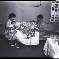 Displaying a quilt made by Morningside Club members in 1928 are, from left to right, Mrs. Farrell Peterson and baby daughter, Maria, and Mrs. Anthony Federico. Each block of the friendship quilt is embroidered with a club member's name. Visible names include "Nell Coctane," "Mae Smock," "Almeda Smock," "Dorothea Portgier," "Birdie Porter," and "Bird McCormick." The names "Ella" and "Verna" are also visible, but the last names are not. In the corner a table with a lace table cloth and plates and cups is visible. In the background is a poster board covered in photographs, and a framed photo of a group of people looking at a book.