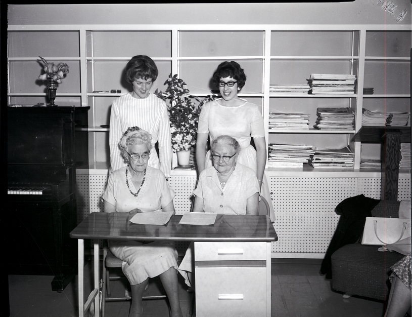 Representing the oldest and the youngest members of the Morningside Club are, standing from left to right, Mrs. Will Gurski and Mrs. Farrell Peterson, and seated from left to right, Mrs. Vera Holland and Mrs. Frances Osborn. They are all wearing dresses. On the table in front of them are secretaries' books containing the minutes of the meetings for the past 50 years. In the background are some book cases, a piano, some vases of flowers, a document stand, an a woman sitting on a couch.