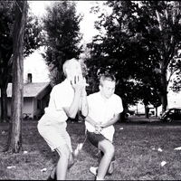 Egg white dribbles down the arms and shirt of Ken Masoner, son of Mr. and Mrs. Elwood Masoner, after competing in the egg-throwing contest at the 18th Annual BPOE picnic. John Jensen, son of Mr. and Mrs. Don Jensen, stands beside him. They are both wearing white shirts and shorts. In the background the trees of the fairground, a parked automobile (car), and a house are visible.