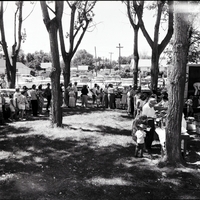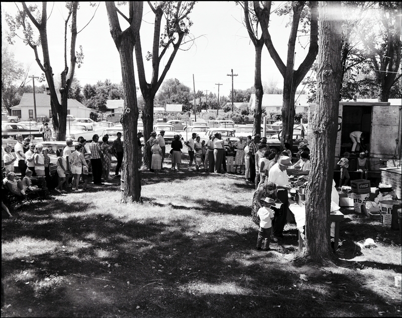 A group of people wait in line for the potluck table of food at the 18th Annual BPOE picnic. At the front of the line, a woman helps a little boy in a cowboy hat. Behind them several men, women, and children stand in a semi-circle line approaching the table. A few children at the end of the line sit on folding chairs. To the right, a man unpacks things from the back of a truck, and two children sit on the bumper. Several barrels and boxes are behind the potluck table. The trees of the park, parked automobiles (cars), and houses are in the background.