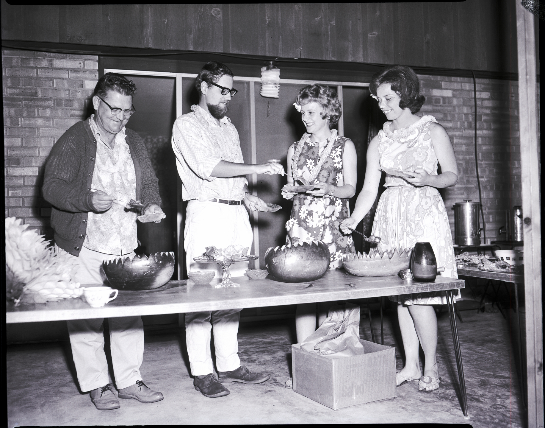 Two men and two women stand beside a table covered in bowls of salad, helping themselves to the potluck dinner buffet at Mrs. Charles Hopkins Hawaiian luau in honor of six members of the Experiment in International Living. The second man from the left is Lawrence Gould. They are all wearing leis around their necks, and the women have flowers in their hair. The side of the house is in the background.
