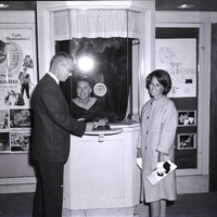 Mr. and Mrs. Robert Tullis stand outside the Ramona Theater ticket booth to see the "Bourgeois Gentleman" play in Buhl. Mrs. Aldrich Bowler sits inside the booth, and hands Mr. Tullis a ticket. The posters to the sides of the booth read "Walt Disney's Thomasina" and "Antique Festival Theatre Presents Bourgeois Gentleman by Moliere." Some people can be seen inside the theater through a window.