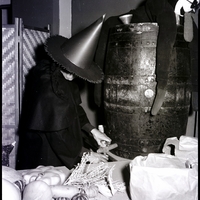 A woman dressed in a black robe and witch hat dispenses some cider from a large wooden barrel at the Newcomers Couples Club Halloween Party held at the Rogerson Hotel. A dressed up dummy sits on top of the barrel. On the table in front of her are various different pumpkins, squashes, and grains. Some paper sacks sit on the table to the side of the squash.