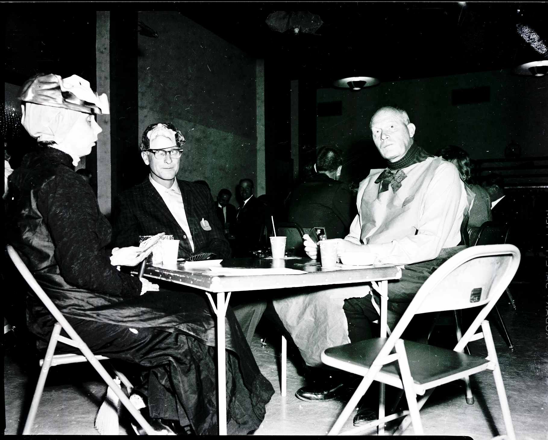 From left to right, Mrs. R. B. Lemmon, R. B. Lemmon, and Bernard Schmidt sit at a card table in folding chairs and play Bridge at the Newcomers Couples Club Halloween Party held at the Rogerson Hotel. They are dressed in crazy costumes. Some cups sit on the table. Other people sit at tables visiting in the background.