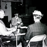 From left to right, Bernard Schmidt, Mrs. Paul Wetter, and R. B. Lemmon sit at a card table in folding chairs and play Bridge at the Newcomers Couples Club Halloween Party held at the Rogerson Hotel. They are dressed in crazy costumes. Some cups and ashtrays sit on the table. Apples hanging on strings from the ceiling are in the background.