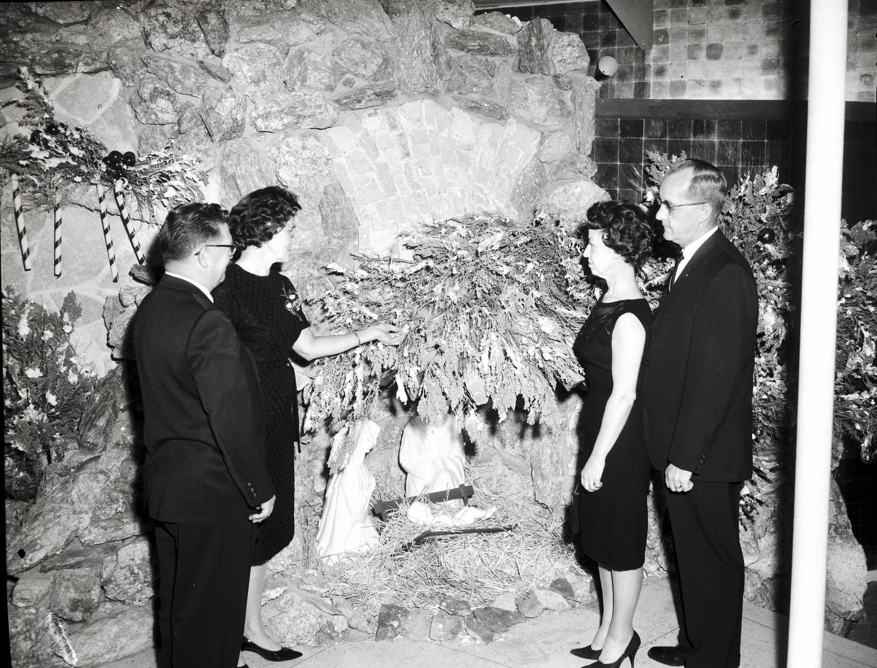 Mr. and Mrs. H. L. Derrick, left, and Mr. and Mrs. Egon Kroll, right, admire a nativity set in the rock fireplace at a Christmas party at the Blue Lakes Country Club. Candy canes hang off the sculpture. The two men are dressed in suits and ties, and the two women are dressed in black dresses.
