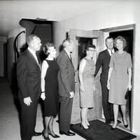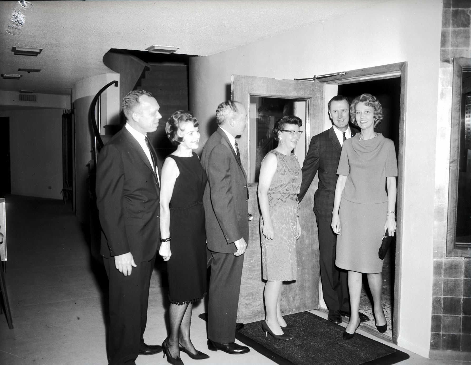 A group of city officials arrive at the doorway of the Blue Lakes Country Club for a Christmas party. From left to right are Mr. and Mrs. Robert Warberg, Mr. and Mrs. Frank Feldtman, and Mr. and Mrs. William Langley. The three men are wearing suits and ties and the three women are wearing dresses. In the background, a hallway and the banister to a staircase are visible.
