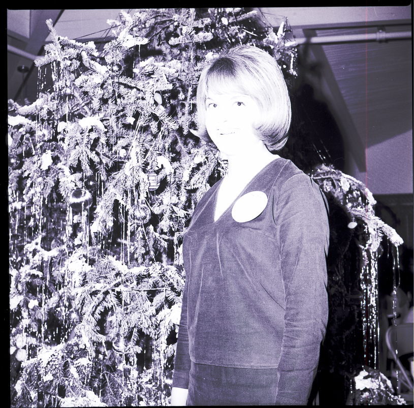 Cheryl Couch, the reigning Miss Twin Falls, was a featured speaker at a social to acquaint prospective contestants for the Miss Twin Falls Pageant, held at the Blue Lakes Country Club. She will represent Twin Falls County and the Twin Falls Lions Club in the Miss Idaho Pageant in June. She is dressed in a V-neck shirt and skirt and stands in front of a large Christmas tree. The tree is decorated in tinsel and bulbs.