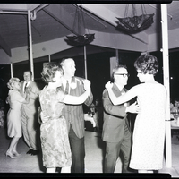 Three couples dance to music of the Allen DeVries Orchestra at a Blue Lakes Country Club social held by new members for old members. The men are wearing suits and ties and the women are wearing dresses, and one man has a large music note pinned on his jacket. In the background, people are seated at small circular dining tables eating dinner. Chandeliers hang from the ceiling.