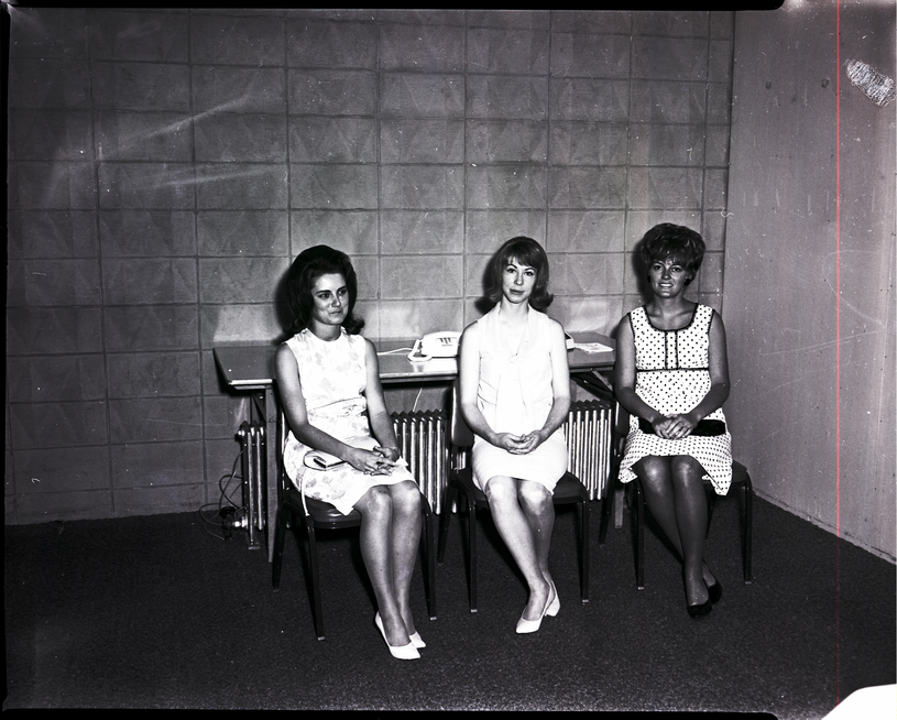 - From left to right, Miss Twin Falls pageant candidates Judy Clark, Marilynn Rappleye, and Pamela Jones sit in chairs in front of a table. A telephone sits on the table. They are all wearing dresses.