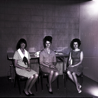 - From left to right, Miss Twin Falls pageant candidates Jill Dunagan, Sherry Stuart, and Carol Christensen sit in chairs in front of a table. A telephone sits on the table. They are all wearing dresses.