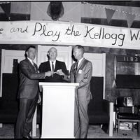 State officers Virgil McKenzie, Weldon Haskins, and William S. Hawkins stand behind a podium at a BPOE convention held in Twin Falls. Mr. McKenzie hands Mr. Hawkins a gavel. All three men are dressed in suits and ties. Three large plush chairs are behind the men. Some chairs and an ashtray are in the corner. On the back wall is a display that reads "1183 In Memoriam." Hanging from the ceiling above the men is a string of pennants and a banner that reads "Come and Play the Kellogg Way Midwinter Convention '66." An elk head is mounted high on the wall in the background.