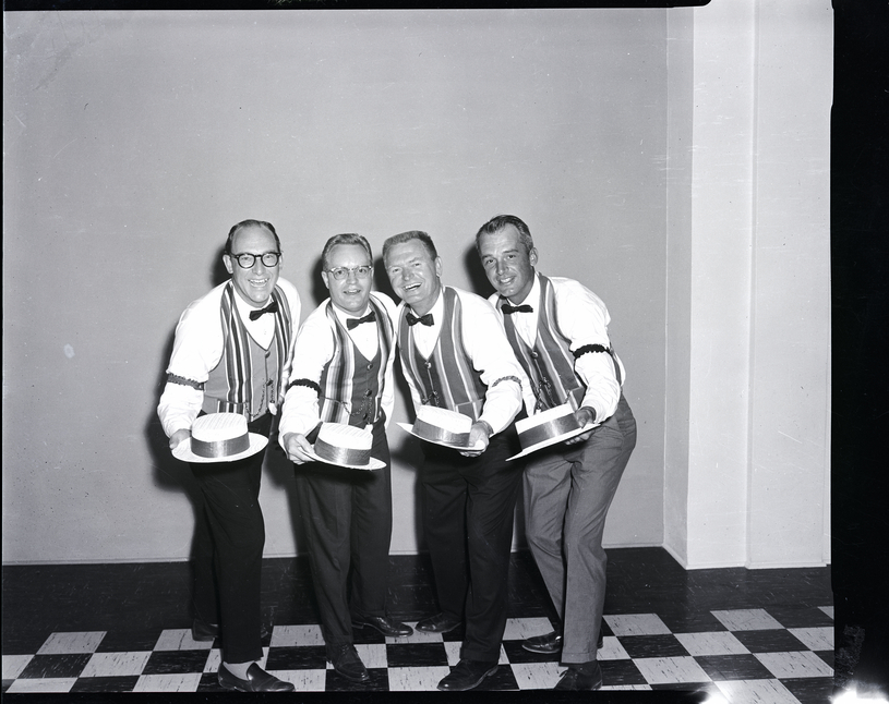 - Dilettantes members Ivan Squires, Del Slaughter, Henry Wills, and James La Grone, dressed in striped vests and bow ties, pose with their hats after being selected for the Dilettante Group of the Magic Valley's production of "The Music Man."