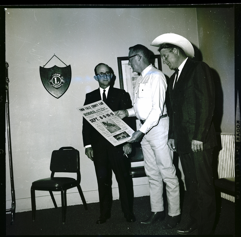 From left to right, Thomas Shouse, fair manager, Harold Hove, acting chairman of the fair board, and Cotton Rosser, producer of the 1965 rodeo, look over a flier at a fair board press dinner. The flier reads "Twin Falls County Fair. Filer, Idaho. Rodeo Cotton Rosser Flying U Rodeo Co. World famous clowns and bullfighters Wilbur Plaugher and Joaquin Sanchez, Chuck Parkinson announcer. Sept. 8-9-10-11. Free afternoon entertainment Sept. 8, 9, 10. Riding club jamboree and drill Saturday, Sept. 11 Horse Show. Night rodeo Sept. 8, 9, 10, 11. Livestock and crop exhibits. $12,000 premium money." A photo of a cowboy on a bucking horse is on the front of the flier. Thomas Shouse and Cotton Rosser are dressed in suits and ties, and Cotton Rosser is wearing a cowboy hat. Harold Hove is dressed in a white shirt and pants and is holding the flier. Behind them are some chairs against the wall, a framed certificate, and a Lions International insignia hangs on a plaque on the wall.