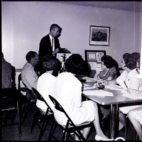 Christ Rouseff, president of the DEK Processing Company, demonstrates the new photo recorder for driver's license photographs. A man and several women in dresses are seated in folding chairs around the table watching. Around thirty representatives of driver license bureaus of nine counties attended the demonstration at the American Legion Hall in Twin Falls. Papers and ashtrays are on the desk. Chairs surround the desk. A painting hangs on the back wall. In the corner is a bulletin board with certificates pinned on it. A painting hangs on the back wall.