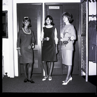 Three teenage girls model some back-to-school fashions for the Twin Falls High School Girl's League Fashion Show. From left to right are Connie Babble, Cathy Pond, and Pam Jenkins. Connie Babble is wearing a one-piece dress with a striped collar and cuffs, Cathy Pond is wearing a skirt and tunic top over a checkered blouse, and Pam Jenkins is wearing a sweater with a floral design and a skirt. The doors to some dressing rooms are behind them, and a sign on the door reads "Please! Employees Only!" To the sides of the dressing rooms, a mirror and some dressing hanging from hangers are visible.