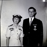 Linda Wilson and Fredrick Coggburn had the opportunity of making extensive tours of the Southwest and Great Britain, sponsored by the special activities program of the Civil Air Patrol. Both are seniors at Twin Falls High School. They are dressed in their CAP uniforms. Linda Wilson is wearing tags that read "Cadet Civil Air Patrol" and "Wilson." Fredrick Coggburn is wearing a jacket that has "United States Civil Air Patrol" embroidered on it.