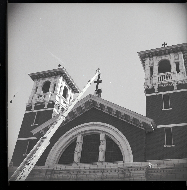 the cross was loose. A man in a hard hat stands on top of the roof next to the cross, helping with the removal. The side of the crane reads "Northwest Crane & Rigging and Transport Austin Western." An arch on the building of St. Edward's Catholic Church reads "This is no other but the house of God and the gate of Heaven Genesis XXVIII 17." The two bell towers are visible to the sides of the roof with the cross.
