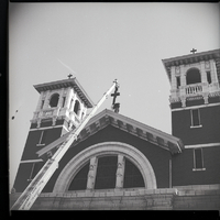 A large crane removes the cross from the top of St. Edward's Catholic Church after the church custodian, George Miller, discovered the base of the cross was coming apart and