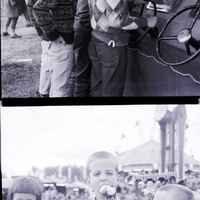 A group of young boys play a Nash Chevrolet game at the Midway at the Twin Falls County Fair. A boy holds a steering wheel on the outside of the booth, while a man inside the booth instructs them. Stuffed animals hang from the ceiling of the booth. Some girls can be seen standing in front of a different Midway game booth in the background. In the bottom image, two little boys and a little girl enjoy some fair food. The center boy, dressed in a plaid shirt and sweater, is eating a caramel apple, while the boy to the right watches. The girl on the left, dressed in a shirt and floral print pullover, holds some food to her mouth. The carnival rides, including the large Ferris Wheel, are visible in the background behind them.